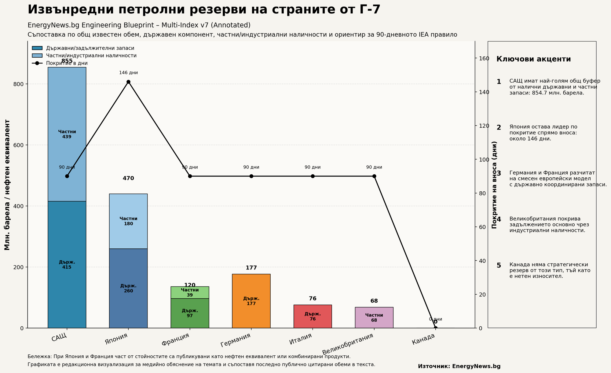 Страните от Г-7 разполагат със значителни извънредни петролни резерви, но структурата им е различна по държави. САЩ и Япония изпъкват с най-големи буфери, докато Европа разчита на смес от държавни и индустриални запаси.