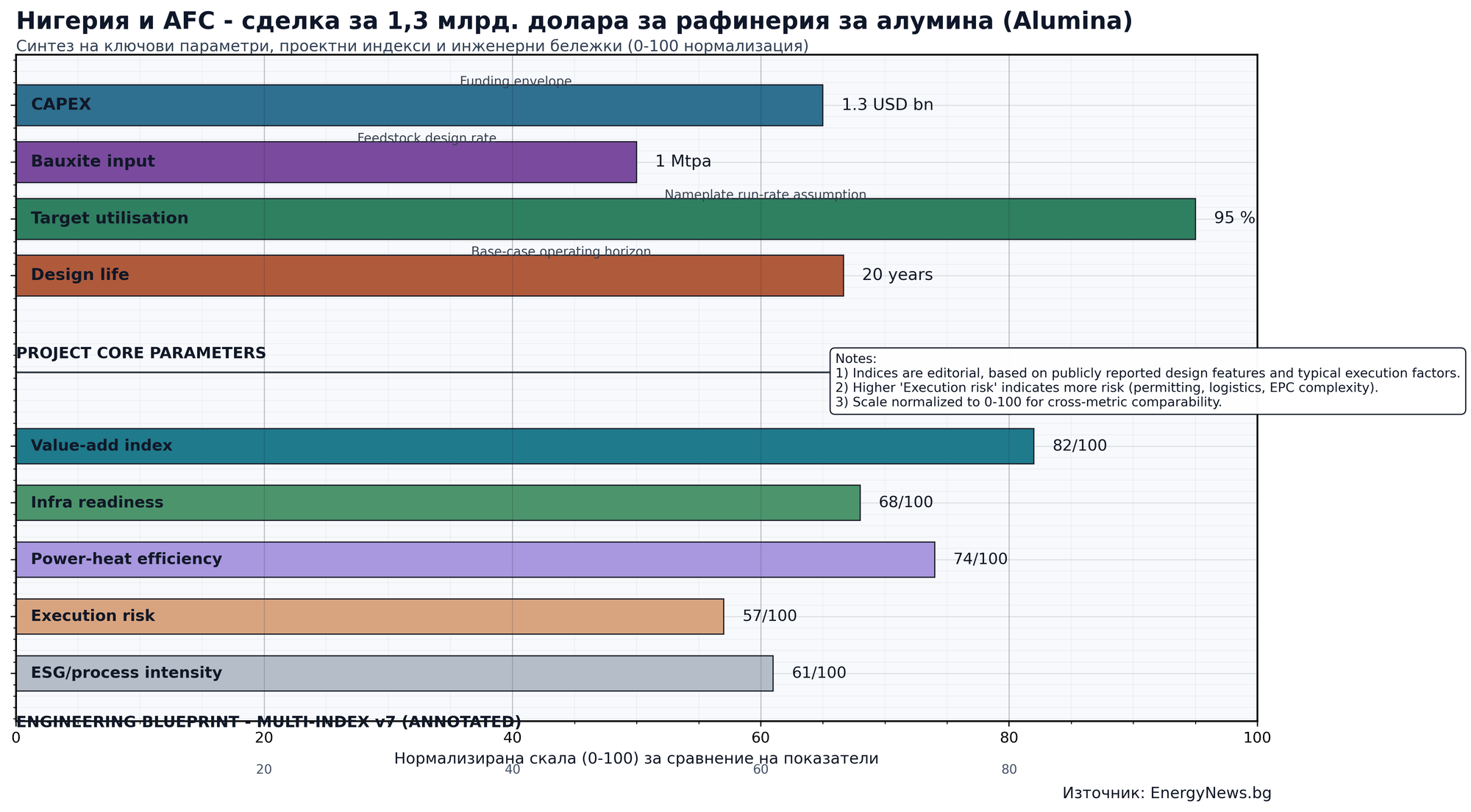 По публично оповестените параметри проектът предвижда инсталация с капацитет за обработка на около 1 млн. тона боксит годишно, с целева експлоатация около 95% и проектен хоризонт 20 години. Очакването е новата рафинерия да намали зависимостта от износ на суровина и да пренасочи по-голяма част от стойността по веригата към местната индустрия, включително чрез доставки, услуги, поддръжка и логистика.